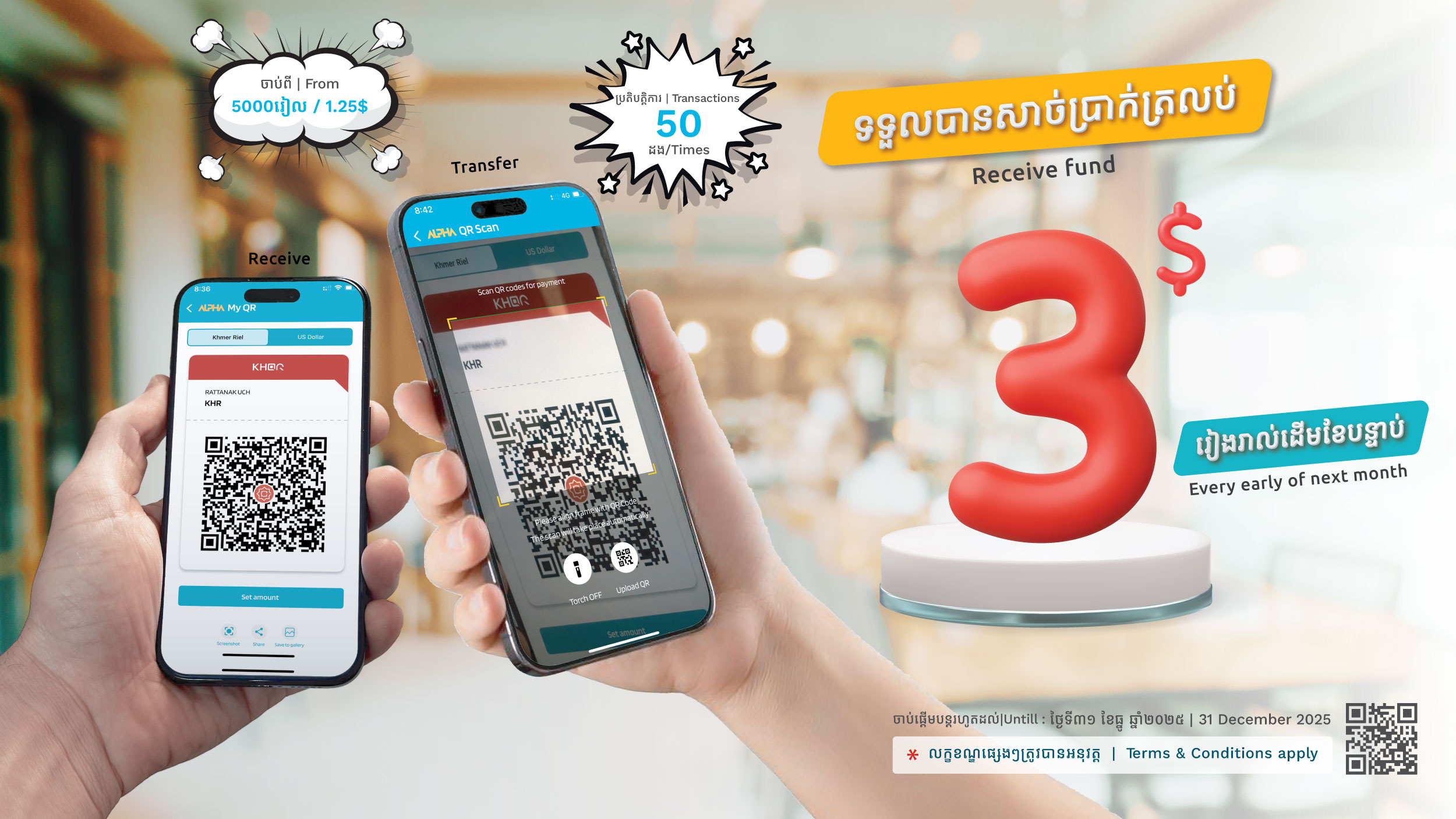 Available in 2 currencies: Khmer Riel (KHR) and US Dollar (USD).